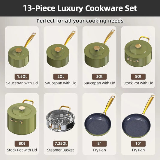 Nuwave Lux LE 13-Pc Cookware Set with Elegant Gold Handle Diamond Infused Ceramic Non-Stick PFAS Free Premium Metal Lids Avocado