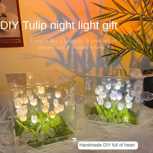 Artificial Tulip Flower Night Light Handmade DIY Bedside Lamp LED Night Lamp Bedroom Decor Christmas Birthday Gifts Table Lamp