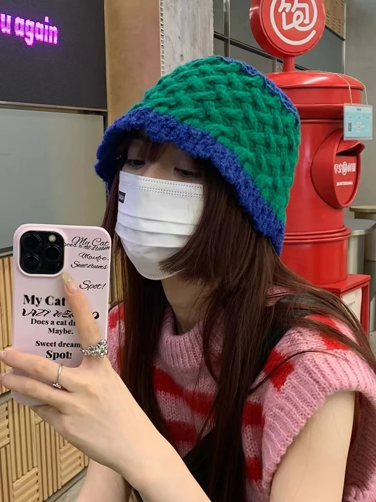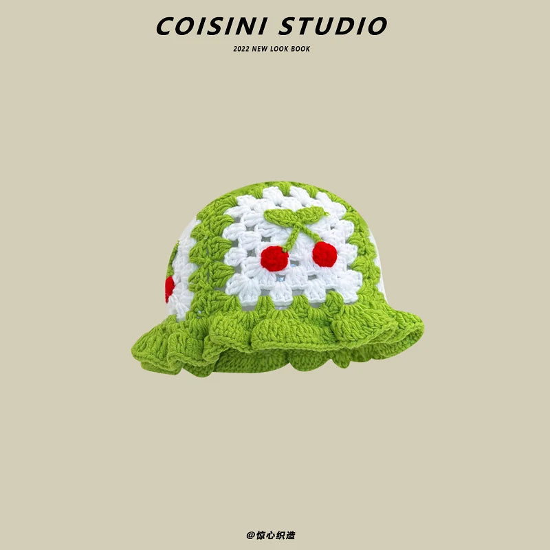 2022 New Korean-Japanese Hand Buckle Crochet Bucket Hat Spring and Autumn Winter Sun Hat Female Cherry Designer Bob Basin Hat
