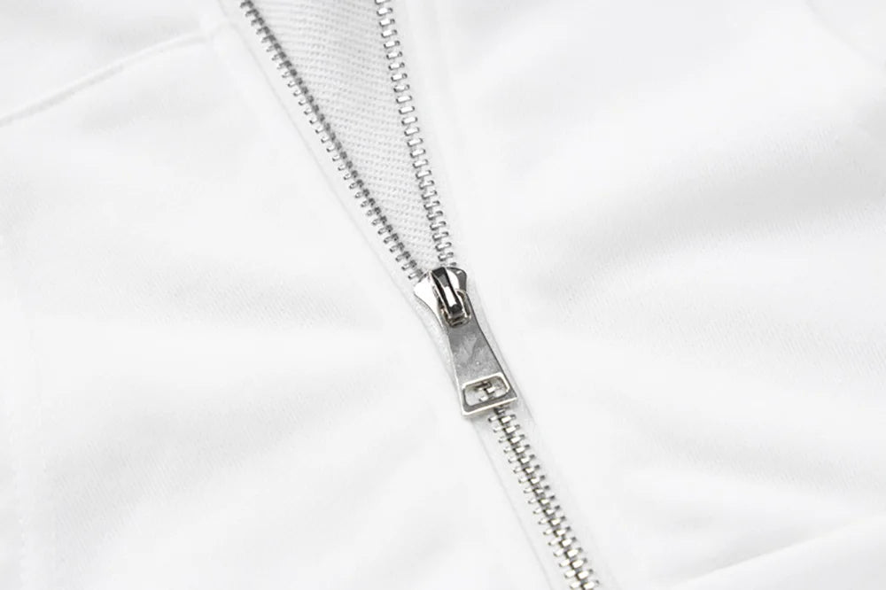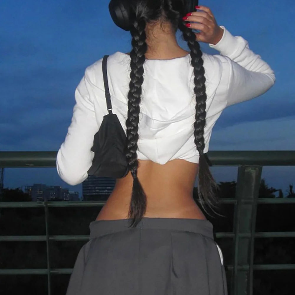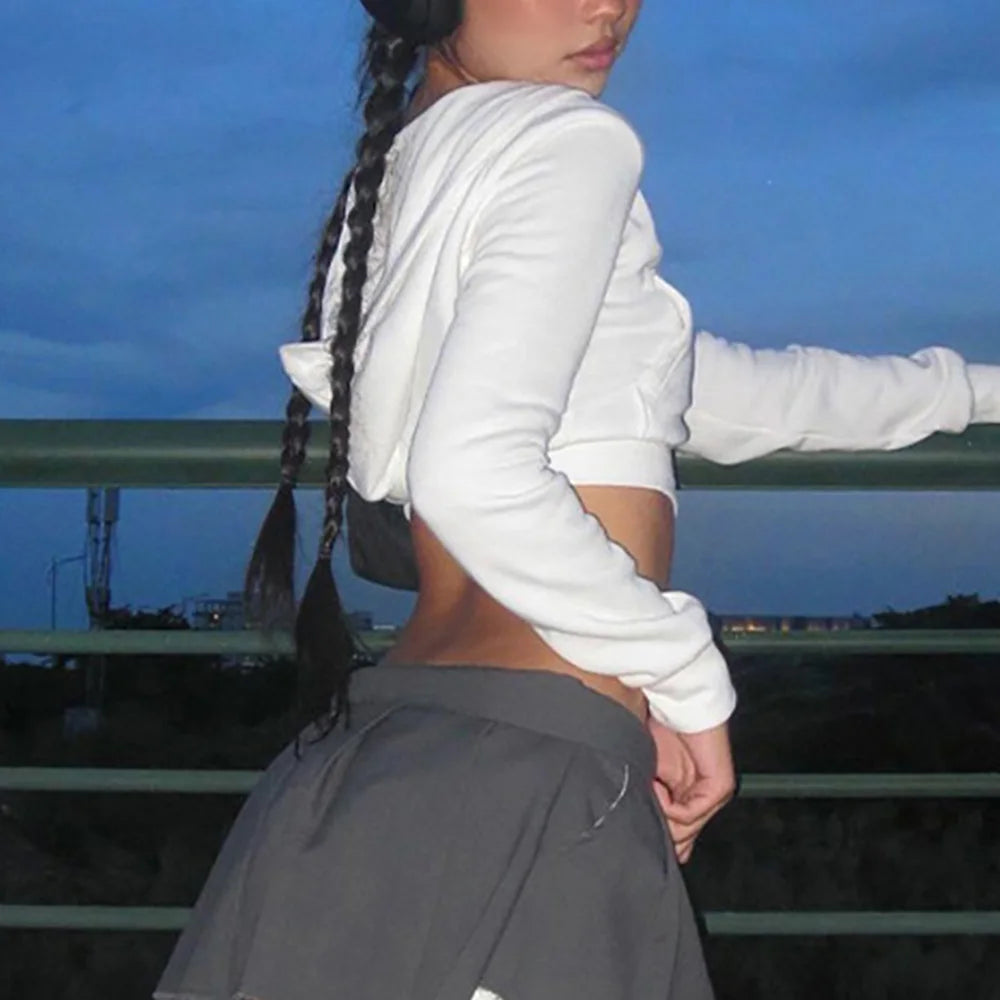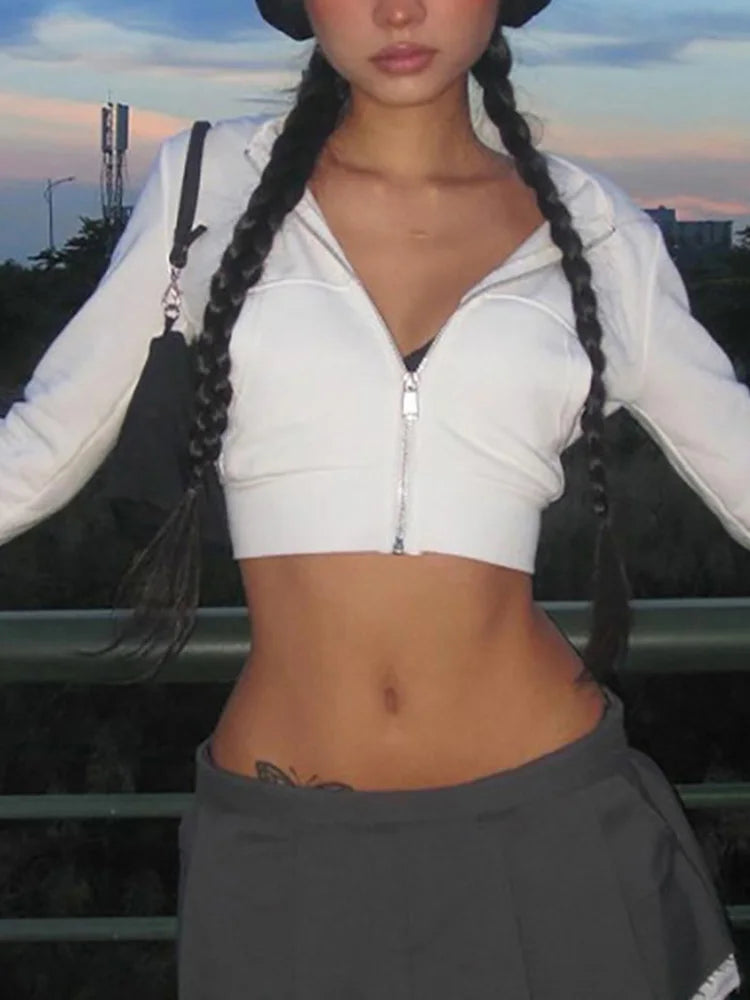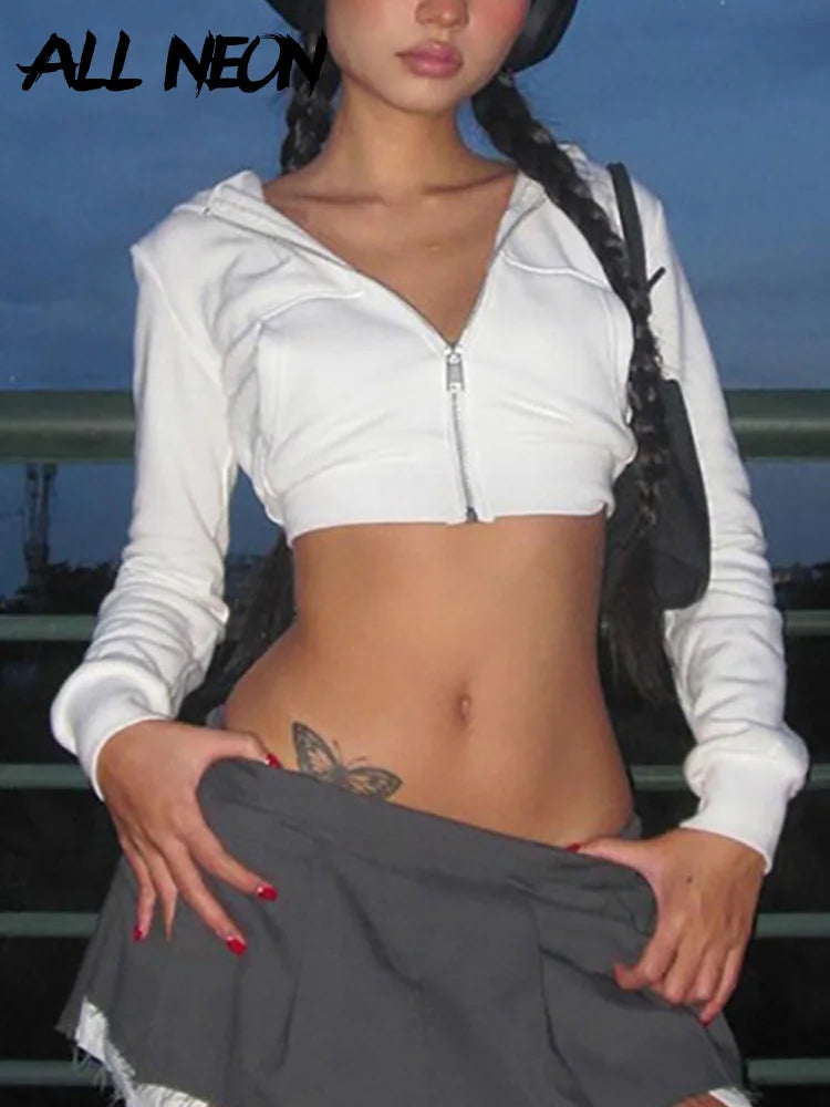ALLNeon Y2K Aesthetic Vintage Basic Zip Up White Cropped Hoodies 2000s Fashion Big Pockets Front Hooded Long Sleeve Sweats Cute