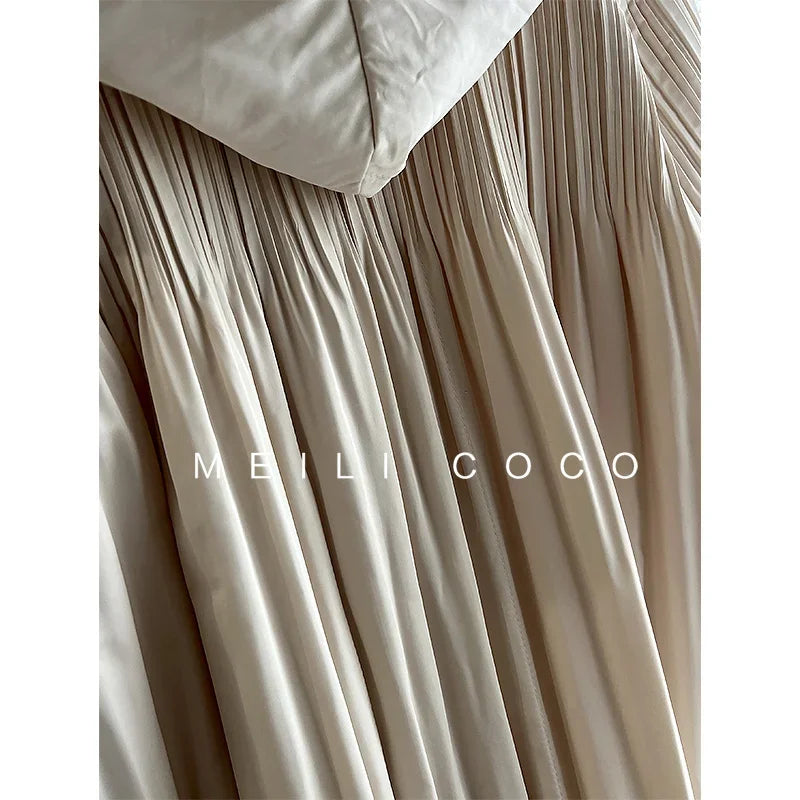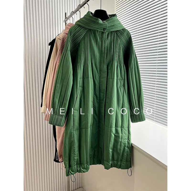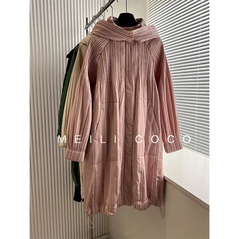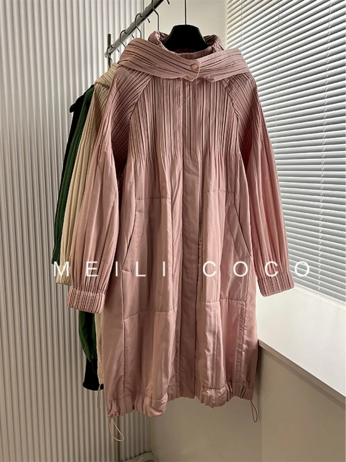 ALSEY Miyake Pleated Solid Collar Hooded Fashion Women's Jacket 2024 Autumn Winter New Long-sleeved Slim Lengthened Windbreaker
