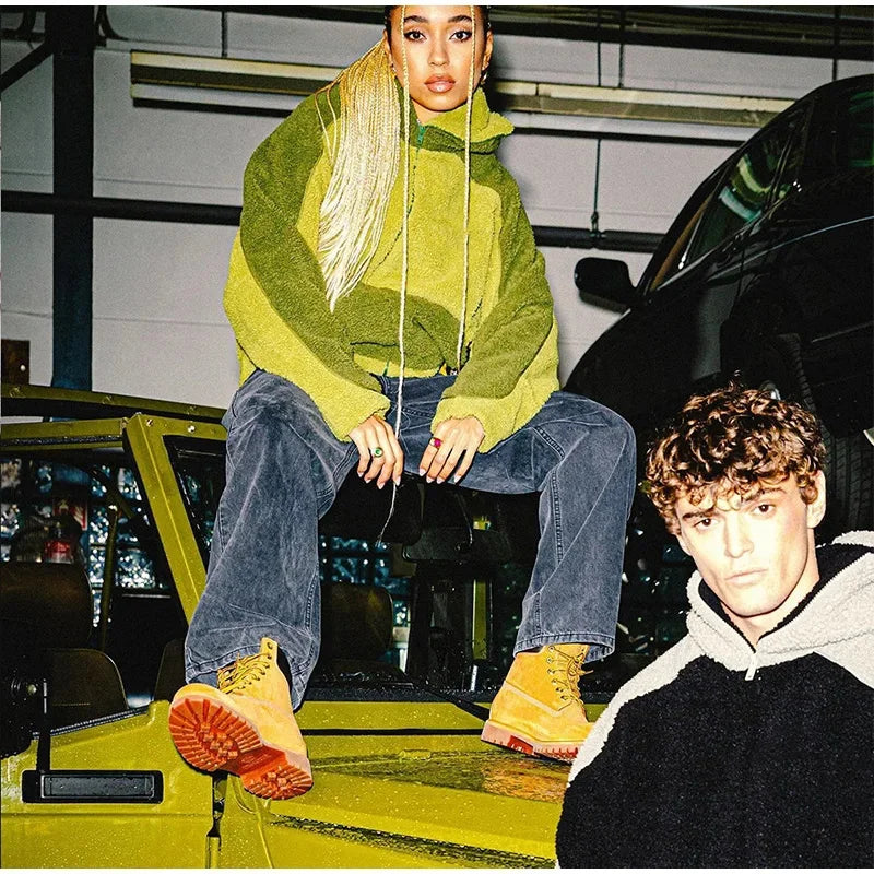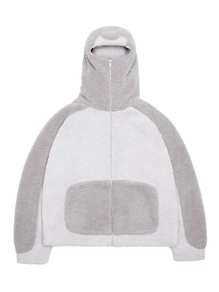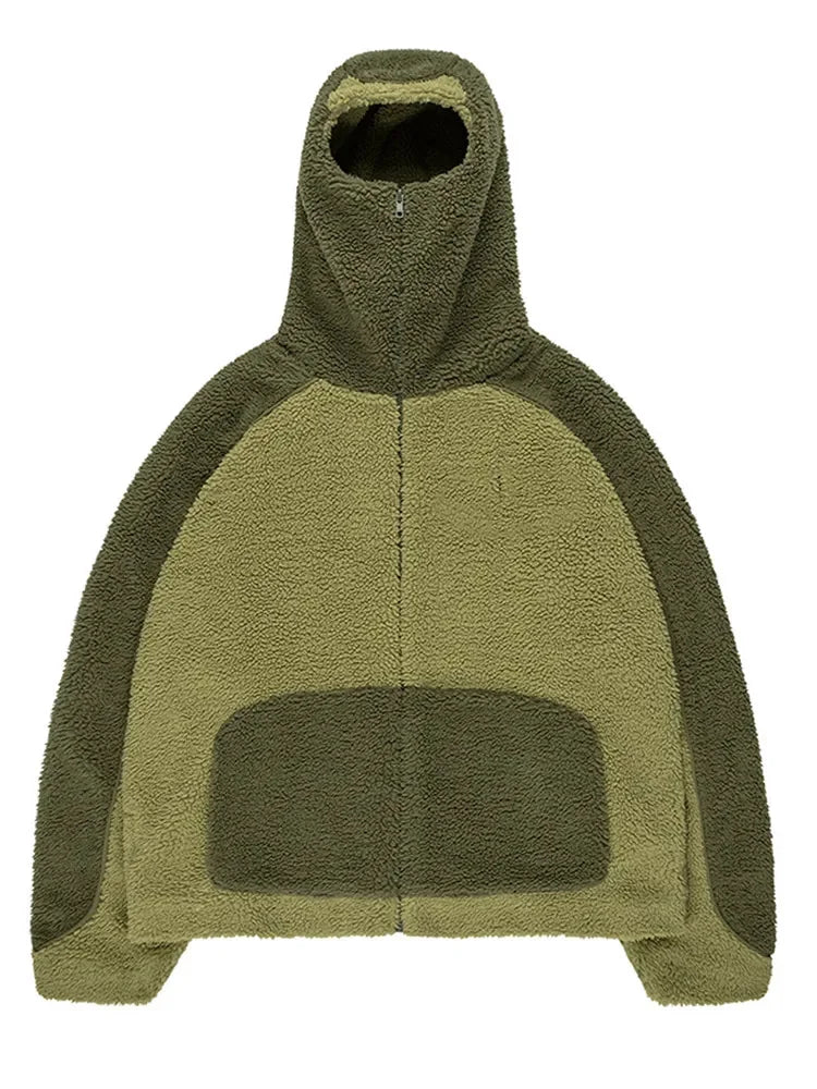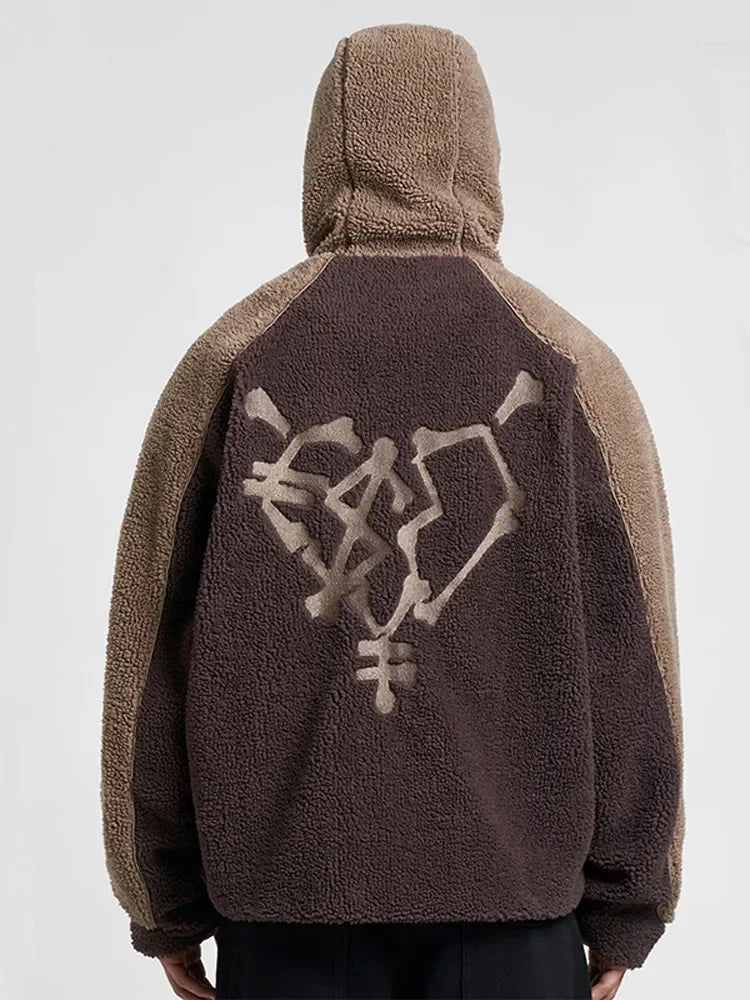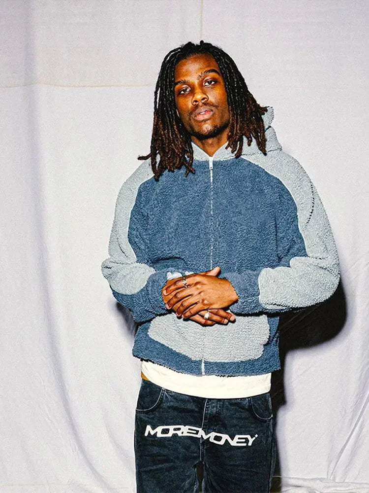 Autumn Winter Lamb Wool Fashion Loose Men's Jacket Contrast Patchwork Hooded Zipper Coat Plush Thicking Warm Couple Clothing