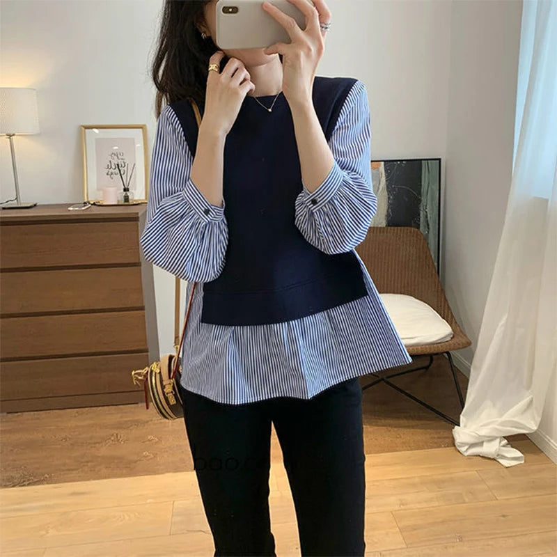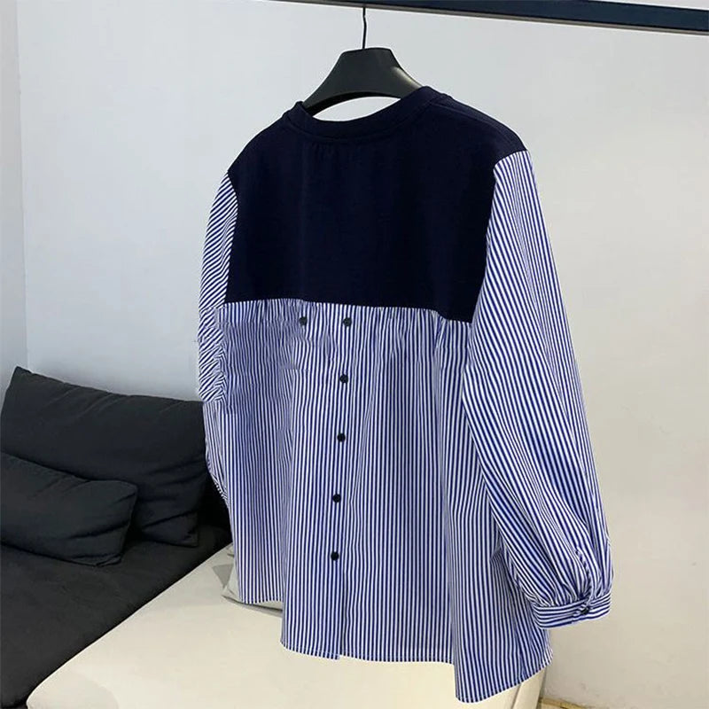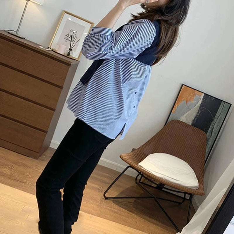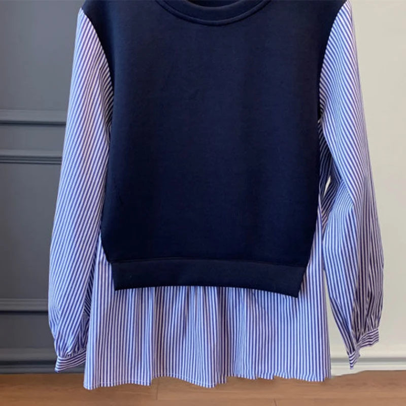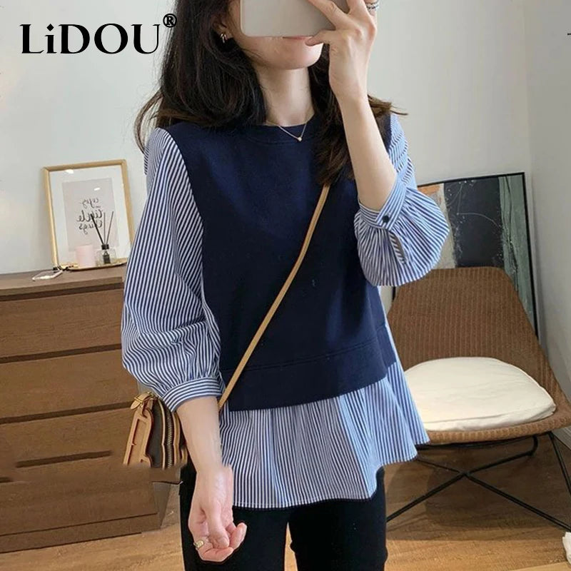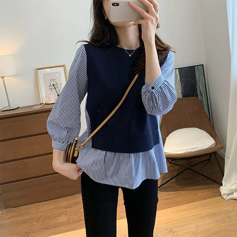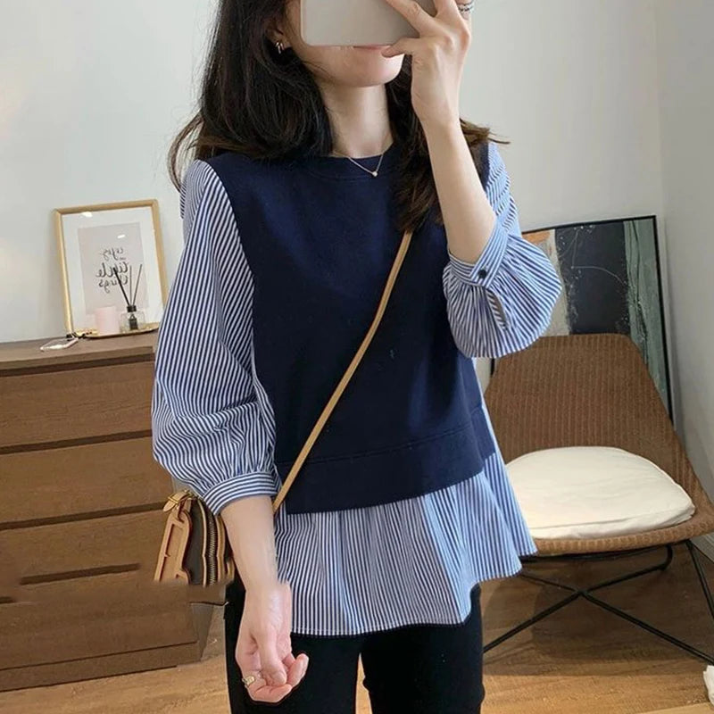 Autumn Winter Round Neck Striped Patchwork Loose Casual Sweatshirt Top Women 3/4 Sleeve Jumper All-match Pullover Female Clothes
