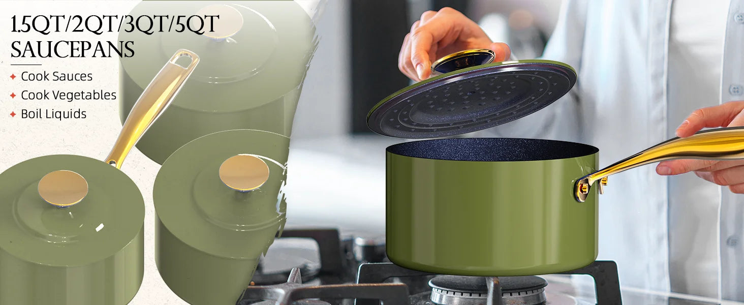 Nuwave Lux LE 13-Pc Cookware Set with Elegant Gold Handle Diamond Infused Ceramic Non-Stick PFAS Free Premium Metal Lids Avocado
