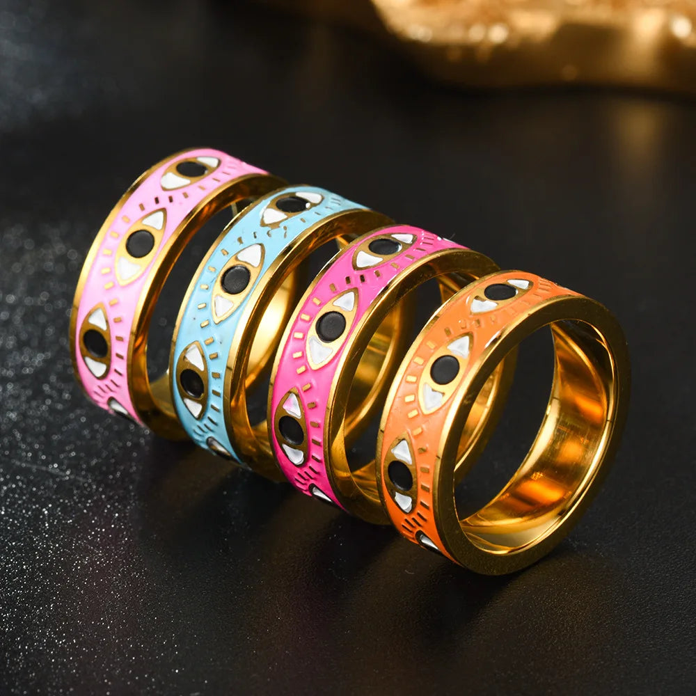 Pink Red Blue Enamel Engrave Cute Lovely Turkish Evil Eye Stainless Steel Rings 6MM Gold Color Eternity Band Rings For Women