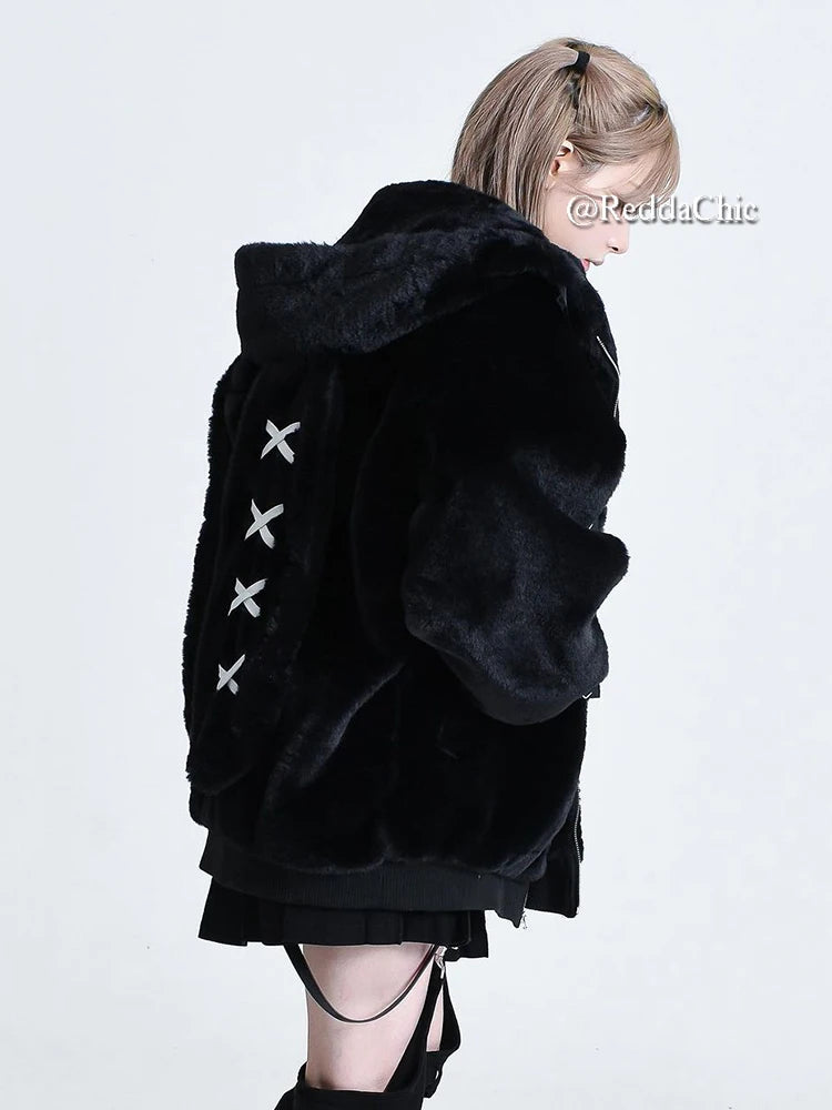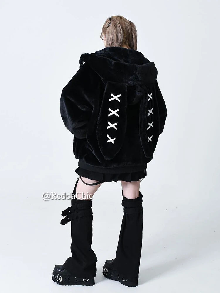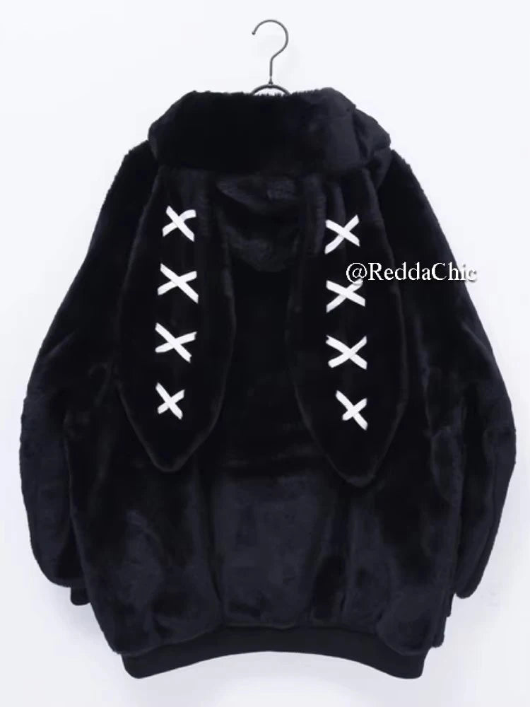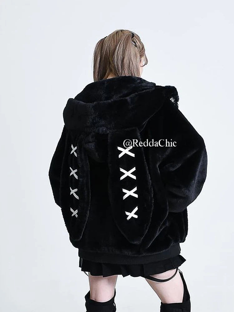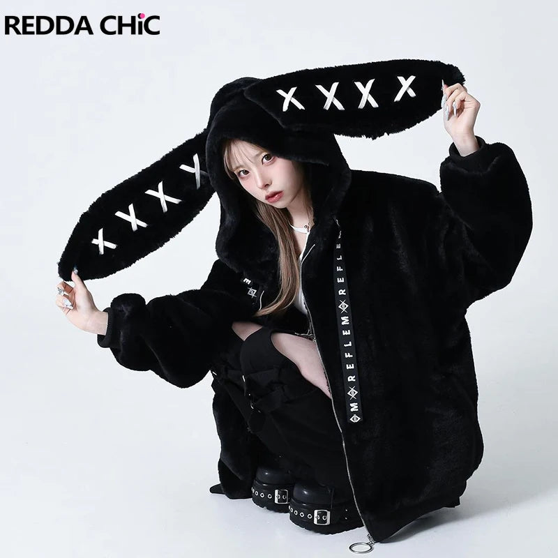 REDDACHiC Rabbit Ear Hooded Plush Coat Women Black Long Sleeve Zip Up Faux Fur Thick Warm Oversize Jacket Lolita Winter Clothes