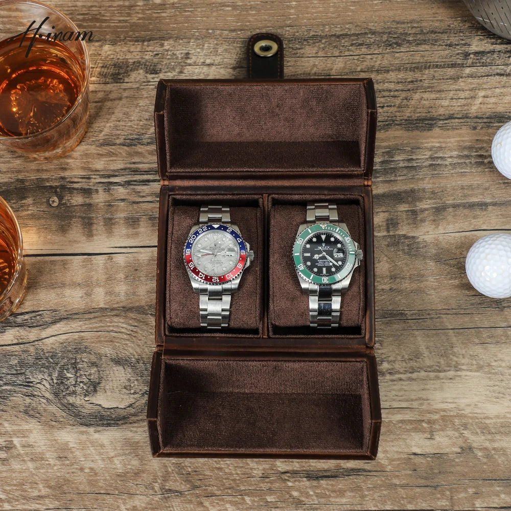 Retro Luxury Genuine Leather 2 Slots Watch Roll Case Travel Portable Organizer Display Storage Box with Pillow Handmade Gifts