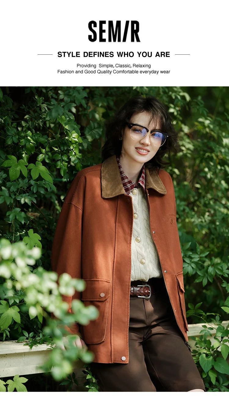 Semir Coat Women Medium Length Color-Blocking Corduroy Collar Retro 2024 New Autumn Embroidery Loose Fashion Jacket