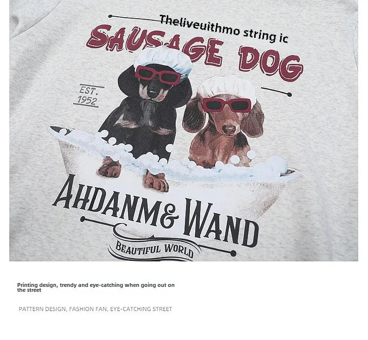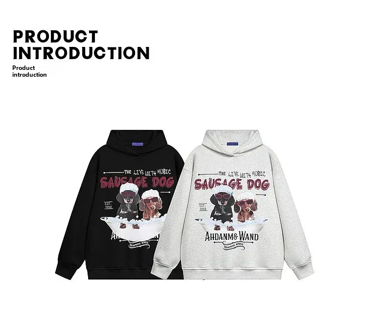 Vintage American Style Men's Creative Cool Dog Print Loose Fit Grey Fleece Lined Hooded Sweatshirt Couple Model Casual Wear
